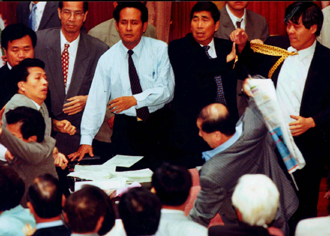 1999年6月15日,“立法院”成了“暴力院”,一整天議事氣氛火爆,從下午到晚間,暴力打人事件頻傳,晚間八點(diǎn)多甚至演出集體暴力場(chǎng)面。無(wú)黨籍“立委”羅福助因?yàn)椴粷M(mǎn)民進(jìn)黨杯葛議事,與民進(jìn)黨“立委”發(fā)生沖突而扭打,一時(shí)間包括羅福助兒子羅明才等數(shù)人都加入戰(zhàn)局,現(xiàn)場(chǎng)打成一團(tuán),朝野“立委”多人掛彩。這場(chǎng)暴力打人過(guò)程長(zhǎng)達(dá)十余分鐘,過(guò)程令人怵目驚心。