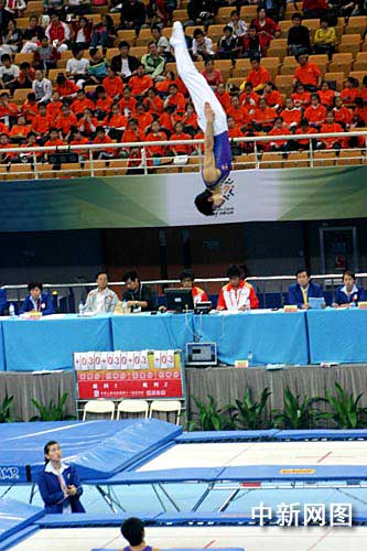 中新網濟南10月12日電 (記者 胡洪林 張譯文 王超) 中國第十一屆運動會蹦床比賽今天在山東省城濟南奧體中心開賽,來自山東、天津、福建、山西等省的13支代表隊、160名運動員將在此爭奪4枚金牌。本屆運動會蹦床比賽分男女團體和男女網上個人4項比賽,團體賽由3名網上運動員和1名單跳運動員組成,獲得團體預賽前8名的隊伍參加決賽。