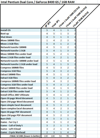 當然值得一提的是,Windows 7的評測是Beta版本,而Vista和WinXP已經完善的升級至SP1或SP3。