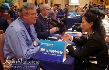 今日(8日)上午,重慶金科大酒店多功能會議廳內人頭攢動,重慶多所中小學的校長及教員在各自展位上擺放好宣傳資料,等待有合作意向的美國校長前來洽談。美方的校長們在展位間穿梭,與“相中”的中方學校展開零距離的交流。漢語和英語在會場內交替使用,使得這場中美漢語教學合作的“雙選會”氣氛格外熱烈。