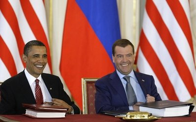 當(dāng)?shù)貢r(shí)間8日,俄羅斯總統(tǒng)梅德韋杰夫與美國(guó)總統(tǒng)奧巴馬在捷克首都布拉格城堡舉行會(huì)面,雙方進(jìn)行了私人會(huì)談。中午,兩人在捷克總統(tǒng)府西班牙大廳舉行了隆重的削減進(jìn)攻性戰(zhàn)略武器新條約簽署儀式。這被認(rèn)為是俄美“重塑”兩國(guó)關(guān)系的關(guān)鍵之舉。