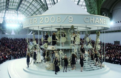 近日,Chanel在北京四季酒店舉辦了08秋冬時裝新品發布,一場華麗的“旋轉木馬”秀成為北京時尚圈一大亮點。在“旋轉木馬”設計里,其實并沒有木馬的影子,菱格紋包、珍珠項鏈、雙C標志、鑲著滾邊的Chanel外套與浪漫蝴蝶結等經典圖騰俏皮地迎接著人們的目光。