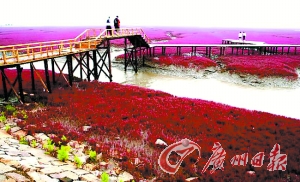 在美麗、富饒的遼河三角洲的海岸灘涂上,延綿百里、大片地生長著一種生命力頑強的潮間帶植物堿蓬草。堿蓬草每年四五月間長出地面,初為綠色,由于受海水的浸泡,太陽光照射下漸由綠變紅,9月至11月,呈紫紅色。秋風吹拂下,紫紅色的堿蓬草涌起重重的波浪,“紅海灘”因此得名。