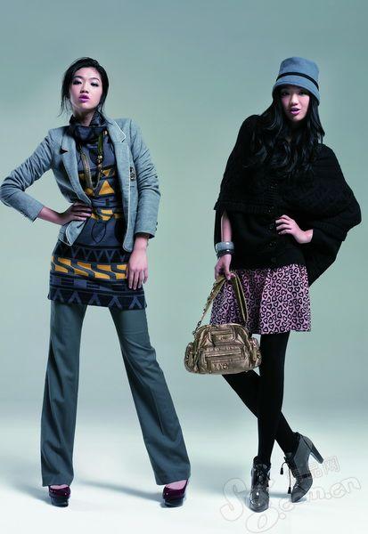 古典斗篷,以針織的方式再現,讓不同的編織方式塑造出兩件套的感覺,令黑色的長毛衣平添了層次,再以鐘形帽來加重英倫淑女風情。粉色桃心印花短裙與金色手包則是搭配中的活潑因子,令搭配時髦而活潑。爵士味十足的深灰色系帶超短靴與帽子的色彩呼應,漆皮的質料則是讓黑色褲襪輕盈起來的小訣竅。
