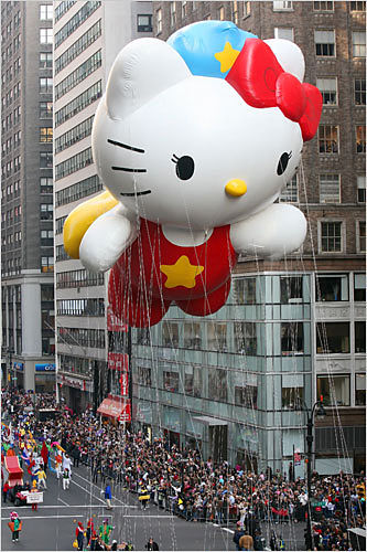 洛杉磯的小姑娘打扮成花季天使,和父母親一起參加十一月下旬的感恩節歡慶活動。感恩節連日長假,是每年美國人最重要的娛樂購物節慶之一。07年美國紐約在當地時間22日舉行了感恩節大游行,萬人參加場面熱烈。巨型卡通造型的氣球吸引了很多人。總共有11個大氣球加入游行,其中包括在天上飄的凱蒂貓,吸引現場所有人的目光,多達800名小丑和11支樂隊,以及2000名拉拉隊員和舞者,將整個游行氣氛推向高潮。 一位紐約市民幽默的說:“我喜歡的是最后會出現的耶誕老人,因為這樣我們可以趕快離開,然后回家開始吃火雞!”