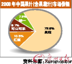 據國際研究公司Euromonitor給本報提供的統計,去年中國果汁(含果蔬汁)市場份額中,統一排名僅次于匯源和可口可樂,以7.2%名列第三位。