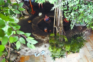 溫泉養(yǎng)生區(qū)的山石、樹根、藤蔓營造出熱帶雨林的幽雅環(huán)境,其中不乏藥池以及石質的按摩床,同時,還引入了死海漂浮、親親魚療等自費項目。泡乏了,可以到二樓享受按摩、足療等服務。