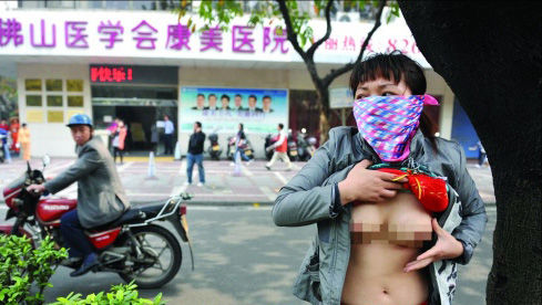 7日上午,趙女士站在廣東省佛山市康美醫(yī)院前的綠化帶中,身披條幅,敲擊銅鈸,一度撩起上衣,露出變形的雙乳,引來(lái)大批人群。趙女士稱3個(gè)多月前于康美醫(yī)院隆乳,術(shù)后雙乳變形,欲索賠8萬(wàn)余元。康美醫(yī)院則稱手術(shù)不理想是她個(gè)人體質(zhì)所致。