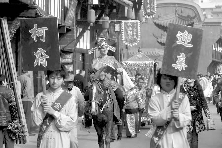 上午9時許,在震天的鑼鼓聲中,33歲的新郎Nicholas(中文名柯家樺)騎著一匹高頭大馬,帶著迎親隊伍由資中鼓樓壩廣場出發,浩浩蕩蕩地前往當地有名的文化古跡文廟。馬背上的新郎羽扇綸巾,而新娘則端坐在花轎中,前有“媒婆”和“丫鬟”帶路。縣城少有如此特殊的迎親隊伍,加之新郎是一個膚色白皙的老外,沿途引得不少群眾駐足。