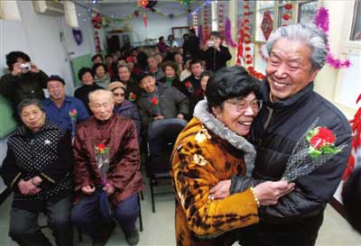 “親愛的,感謝你!”昨天下午,東城區史家社區居委會內,近20對年近古稀的老夫妻聚在一起,其中4對已過金婚。他們學習牽手、擁抱、送玫瑰,“惡補”情人節知識。相濡以沫的老夫妻們,第一次嘗試開口向對方大聲說愛,雙方都不好意思地扭過頭,現場一片掌聲。