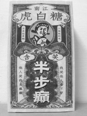 而在“含笑半步癲”糖的背面更寫著:“傳說中的含笑半步癲,是以蜂蜜、川貝、桔梗,加上天山雪蓮配制而成。今人糖白虎改以跳跳巧克力取而代之,不需冷藏,也沒有防腐劑。除了生性猛烈之外,味道還很好!實在是居家旅行,整人自娛,必備良品!”——這段產品解釋更是與《唐伯虎點秋香》中的臺詞不謀而合。