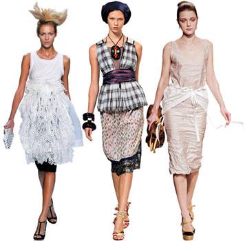 2009春夏,圍裙終于擺脫了“廚房里的必需品”的命運,有幸站上了時尚的T臺,想必十分榮耀。它決心雪洗從前油跡斑斑的污濁形象,走出廚房。看看Marc Jacobs和Prada裙子上的腰部圍裙點綴,是為了凸顯迷人腰部線條,而非烹飪需要。