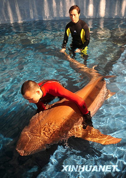 當日晚,廣東省漁政部門從廣州一家酒樓解救出一條護士鯊,并將其送到廣東省水生野生動物救護基地。據悉,此護士鯊為廣州某酒樓從水產市場購得,在酒樓水族箱里展示,接受食客們的預定。環保人士獲知后前往酒樓抗議護鯊,漁政部門隨即前往酒樓將其救出。護士鯊屬于廣東省野生保護動物,受到廣東地方保護法保護。新華社記者 盧漢欣 攝