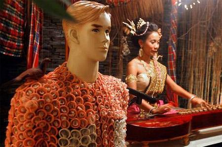 進(jìn)入餐廳的室內(nèi)區(qū),就像進(jìn)入安全套的博物館。墻壁上都是全球具有代表性的安全套產(chǎn)品的展覽,按照國(guó)別分裝在各自的格子里,不同的材料、顏色、形狀,漫步一圈能大致了解安全套的發(fā)展史。屋頂?shù)牡鯚粢惨园踩鬃鳛檠b飾,閃出不同顏色的光芒。餐桌設(shè)計(jì)也很獨(dú)特,桌面玻璃板的圖案是由安全套組合完成。靠墻的餐桌旁還能欣賞到一幅幅被“加工”過的名畫,連舉世聞名的蒙娜麗莎也客串了一回安全套的宣傳大使,手中拿著安全套沖著客人微笑。