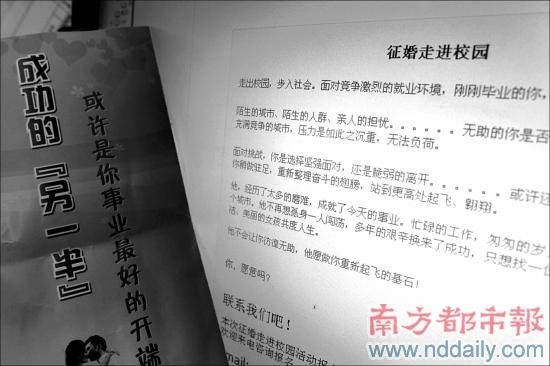 昨日,有網友在奧一網論壇發帖,稱一家名叫做××緣交友網的公司最近幾天在深圳大學女學生宿舍發傳單,內容為“找到另一半,或許是事業最好的開端”,并且還在深圳大學荔園晨風BBS網站上發帖子,宣傳“征婚走進大學校園”活動。該網友說,現在就業形勢嚴峻,也確實有不少女生希望嫁個好老公改變自己一生,但覺得這樣大張旗鼓走進大學校園征婚不合適。