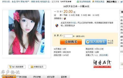 賣時間,賣青春……在創(chuàng)意層出不窮的當(dāng)下,一店主在網(wǎng)上兜售美少女口水的舉動再一次“雷”倒眾人。今日,網(wǎng)友“ximacai”在華聲論壇發(fā)帖稱,雖然淘寶售出的商品花樣諸多,但兜售美少女口水卻還是第一次看到,令他大跌眼鏡。