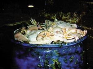 日前,南海當地政府根據記者提供的線索,執法搗毀了多個死鵝、死鴨加工點。在記者暗訪過的一個位于荒地和臭水溝旁的窩點,執法部門發現了堆放在桶里和冰柜里的上百只死家禽,有的已腐爛發臭。用來給死家禽脫毛的瀝青不知反復使用了多久,臭味很重。據查,每天僅這個作坊加工、販賣的問題家禽就有四五百只。