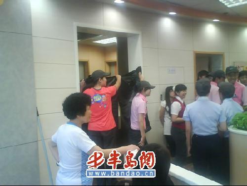 記者恰好在易初蓮花附近,接到小王的電話之后迅速趕到了肯德基。這時候,肯德基店內的員工拿出了不少垃圾袋,將衛生間的門擋了起來,同時店面經理表示已經撥打了110。