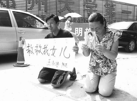記者迅速趕到鄭州大學第一附屬醫院門口,在人行道上,跪著一對年齡在46歲左右的男女,他們舉著一張白紙,上面寫著“救救我女兒”的字樣,下面寫著他們兩人的名字王永濤和楊花。“你們為什么這樣做呢?”記者問,聽到記者的問話,兩人同時流下了淚水,他們拿出了多張女兒的照片:“那是孩子去年照的,現在孩子已變了個樣子!”記者看到,他們的女兒王曉燕清純漂亮,笑容里充滿著對未來人生美好的憧憬。