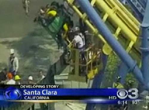 事故發(fā)生在加州圣塔克拉拉市的美國主題公園(Great AmericaThemePark)。據(jù)該市消防部門官員奧吉·威德曼介紹,當(dāng)?shù)貢r間中午12點15分,過山車載著興奮的游客向整個軌道的最高點進發(fā),“就在即將要上爬的時刻突然停了下來”。