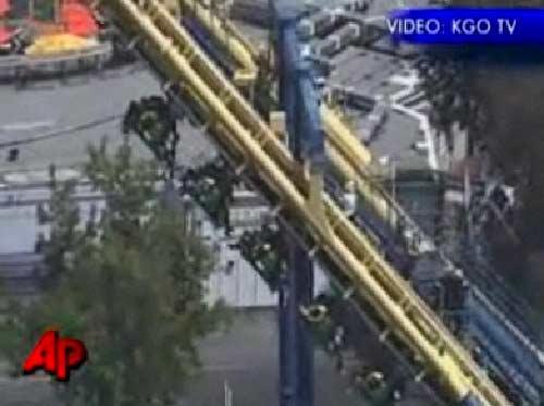據(jù)悉,美國曾發(fā)生多起過山車事故。2009年7月25日,紐約州布朗克斯地區(qū)一家游樂園的迷你過山車發(fā)生脫軌故障,造成7名兒童受輕傷。2007年6月,阿肯色州一家游樂園發(fā)生過山車事故,12名游客在距地面50米的過山車軌道最高點倒掛半個小時。2006年7月9日,辛辛那提市派拉蒙游樂場的過山車在運行途中突然停止造成27人受傷。2005年7月29日,加州迪斯尼樂園的兩輛過山車相撞造成60人受傷。1999年8月在舊金山美國最大的六面旗主題公園內(nèi),一輛過山車在即將翻滾時突然停止,28名乘客在近40攝氏度的高溫里被吊了4個小時。