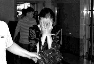 一名女婚托用手遮面。近日,替咖啡廳拉客的10名婚托被警方控制。本報記者 周曉東 攝