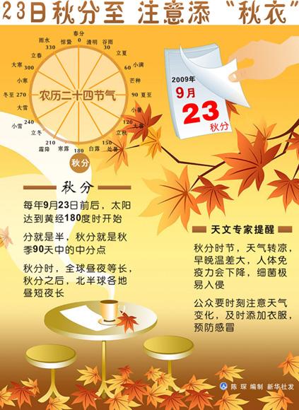 23日將迎來農歷二十四節氣的“秋分”。天文專家提醒,隨著秋分節氣的到來,氣溫降低的速度將明顯加快,公眾要準備好換季的秋裝。