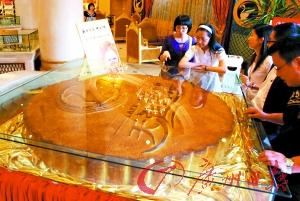 據(jù)介紹,月餅總重為380公斤,直徑160厘米,厚18厘米。為制作此餅,他們專門請了8個師傅做,僅制作成型就花了16個小時,然后又烘烤了4個小時才完成。僅極品蛋黃就用了30公斤,白蓮蓉用了180公斤,面粉用了150公斤。(記者王鵬、何波攝影報道)
