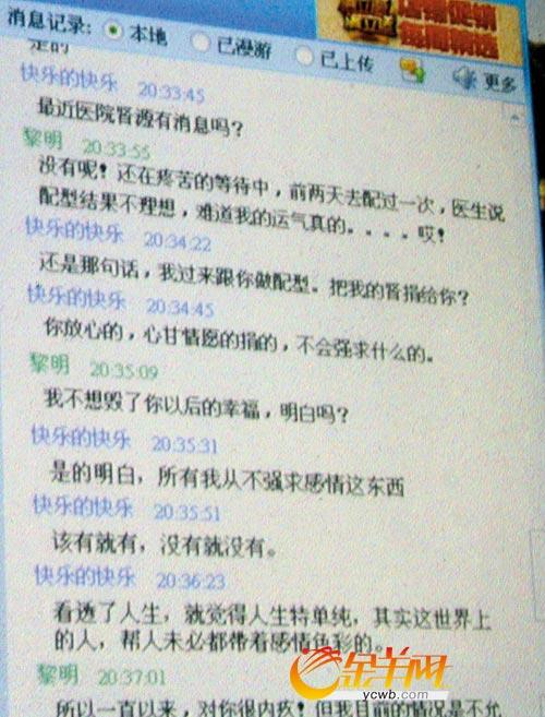 陳修淇和捐腎女孩的qq聊天截屏。上面清晰顯示“仍愿意捐腎,不帶感情”