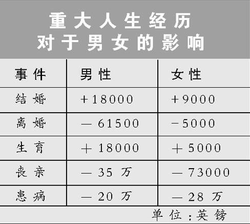 澳大利亞昆士蘭科技大學(xué)教授保羅·弗里吉特斯稱,婚姻、生子、喪親等重大人生經(jīng)歷對(duì)于人類幸福和痛苦感的影響可以用金錢來(lái)衡量,而在這些重大經(jīng)歷上,男女之間的感受差別都很大。