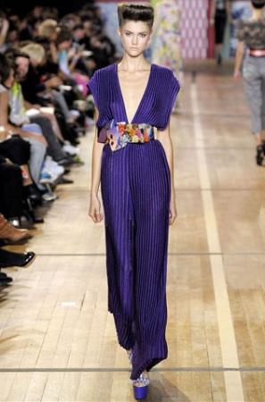 和式設計本季尚未退出潮流舞臺,Basso &Brooke用深V領的衣襟和印著馥郁花朵的寬闊折紙感腰帶,將和風融入希臘女神裙的設計,顯得性感而比例姣好。而豎直褶裥面料,讓人想起三宅一生最著名的設計,這樣的紋路的優點,就是讓人更加纖長,曲線畢露。