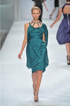 不對(duì)稱垂懸式肩袖,在身后形成飄逸的線條,前胸和腰間的圍裹設(shè)計(jì),則是希臘風(fēng)格常見(jiàn)的手法。