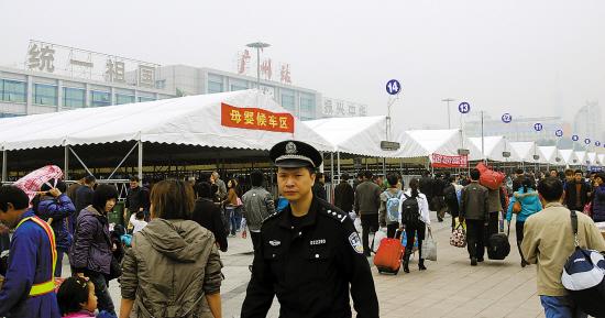 據廣州火車站站長尹鐘民測算,由于實名制多了一道驗證環節,乘客進站時間或可增加到以前的幾倍,因此乘客候車區所需面積也將大大增加。為此,廣州火車站廣場共搭建15個臨時候車雨棚(長48米、寬10米),其中七、八號棚為母嬰和持特殊證件人群臨時候車雨棚,每個雨棚計劃安排各車次臨時旅客約3000人。