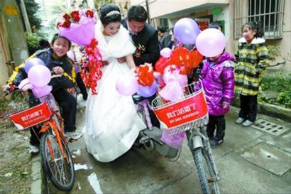 中午12點整,記者趕到梅隴七村,58號樓前停放著一排橘色自行車,車身飾以彩帶氣球,車頭“我們結婚了”的大幅紅字喜氣洋洋。在熱鬧的鞭炮聲和親朋好友的祝福中,新郎孫軍將身披婚紗的新娘扶上自行車后座。隨后,新郎一騎當先,18輛“喜車”涌出了新村,一路歡歌笑語。如此“壯觀”的場景自然受到路人的矚目,不少市民還以為是在拍廣告,紛紛駐足觀看。