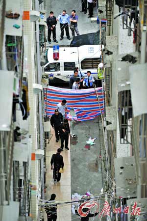 昨天上午11時,記者接到報料后趕往寶安區民治街道民樂新村。在事發現場,警方已經將133棟樓和134棟樓用警戒線包圍起來。133棟樓共6層,134棟樓共13層,跳樓的女子就摔在兩樓之間2米多寬的小巷里。