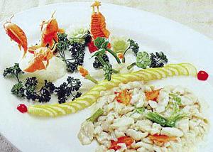 第二道墨魚籽花蝦則是以南瓜茸、蝦球、墨魚籽、麻油散子為原料制作而成,據了解,麻油散子是上海的傳統小吃,此菜在民間小吃的基礎上,增加墨魚籽、龍蝦肉等提鮮食材,經烹調融合為一體,彰顯清淡、環保、綠色。