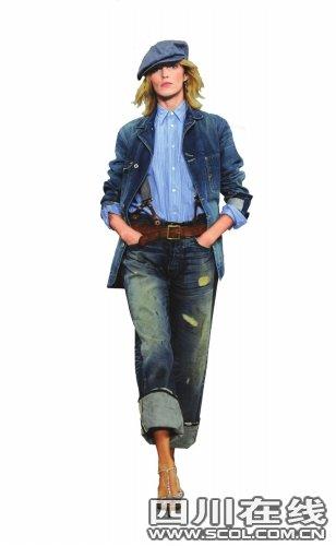 RalphLauren在2010春夏紐約時裝周系列發布會上,讓“男友式”牛仔新勢力大放異彩。卷邊、磨白做舊、夸張的破洞設計的男友式牛仔,加上一絲不茍的條紋襯衫、小西服外套或者牛仔夾克,再配上一頂牛仔報童帽,RalphLauren將女人骨子里的剛強和率性風范發揮到極致,大張旗鼓地向全世界宣示“大女人主義”:即使是牛仔也要穿得比男人更有型。而Lacoste的“男友式”牛仔則更為內斂,保留了經典的寬褲管和卷邊設計,較之有些咄咄逼人的RalphLauren,Lacoste更在有型之中展現輕松平和的生活態度。