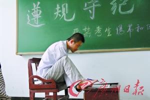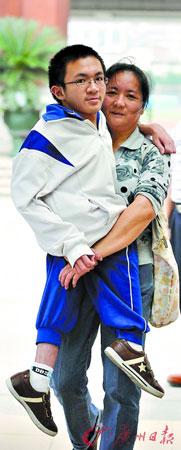 就讀于廣州市越秀外國語學校的高三男生勇仔(化名)的趕考路異于他人:媽媽推著輪椅,將他送到廣州市第三中學考場,接下來就由監考老師接手。勇仔的試室在4樓,兩個壯年男老師一左一右抬起輪椅,將他護送到座位上。由于從出世以來就身患“成骨不全”,勇仔無法靠雙腿行走。從小學5年級至今,他能有機會參加高考,可以說全賴媽媽龔女士的懷抱。