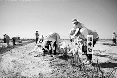 志愿者們正在沙場里植沙障