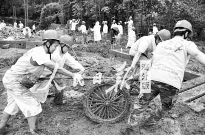 志愿者們正在雨中搬運用作地基的沙石