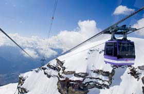 我總有點狹隘地認為外國人都有點“似乎瘋狂”,一逮著點時間就去登山、滑雪。從山下徒步登上山頂的這股累暫且不提,爬上山后再從高高的懸崖跳下去,炫自己的滑雪技術的這股勇氣真是可歌可泣,像我這樣缺少膽量的人自然是不能做此類瘋狂之事,可是面對皚皚白雪和巍巍高山總是心有不甘,而連接雪山的纜車則正好可以滿足我不費吹灰之力也可飽覽群山的愿望。