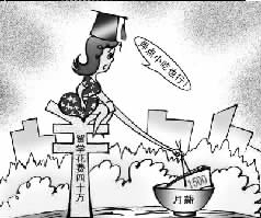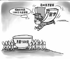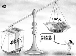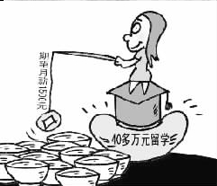 漫畫四:新浪網貼出的漫畫是一桿嚴重傾斜的秤,一頭是40萬百元大鈔,一頭是1500元大鈔,題為“留學所花40多萬元啥時才能賺夠本?”的文字說明憂心忡忡:不吃不喝,想要賺回40萬元得花20年。(萬建輝)