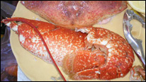 我們接受了店長(zhǎng)的建議,從鎮(zhèn)上的小店買(mǎi)來(lái)面包和飲料回來(lái),待我們歸來(lái),位子也正好等到了,拼桌!看著菜單上豐富誘人的海鮮,我早已等不及了, 點(diǎn)了這里的招牌菜:兩人份海鮮拼盤(pán)(9.5磅每人),其中包括, 美味大蟹,深黃粉紅對(duì)蝦, 多汁鳥(niǎo)蛤(海扇),腌熏三文魚(yú),對(duì)蝦,鯡魚(yú),煙熏馬加魚(yú),蚌和綠蚌貝,另外我們還點(diǎn)了大龍蝦,奶油蒸歐洲蠔(只有9月和4月之間可以吃到)和蔬菜沙拉。品嘗海鮮最好配以檸檬,芥末,醋,壽司醬油,和辣椒醬。 店內(nèi)提供檸檬,塔巴斯哥辣醬油和醋,如果你還想要什么配料,可以在小鎮(zhèn)的店上找到。