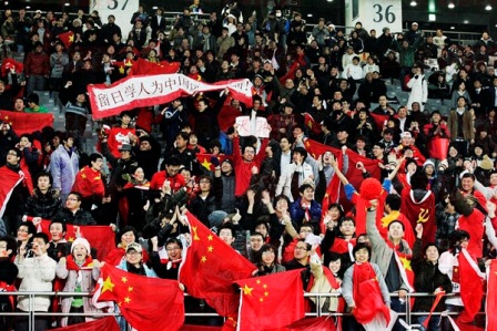 中新網2月11日電 據日本《中文導報》報道,2月10日,東亞四強賽進行第二輪爭奪,在東京味之素體育場中國男足迎戰韓國男足,中國隊最終以3-0大勝韓國隊,一舉改寫在國際A級賽事上32年對韓不勝的尷尬歷史?磁_上約二千名中國留學生的吶喊助威聲也貫穿了整場比賽。