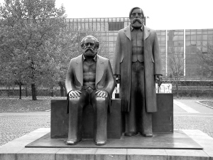 馬恩銅像雕塑,始建于上世紀七十年代的東德時期。據說,關于馬克思坐著而恩格斯站著的造型構思,有兩種解釋,一是馬克思是德國人而恩格斯不是德國人,二是恩格斯是馬克思的戰友和學生。