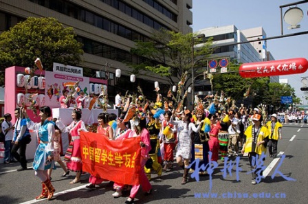 作為最能代表福岡博多的節日之一,也是西日本最有名的全民歡樂節之一,“博多打鼓節”起于平安時代,由一種稱為“松囃子”的民間藝術演變而來,最早的時候,它是向當地領主祝賀新年的儀式,如今已經演變成為福岡地區傳統的節日,市民組織各式各樣的慶祝活動。2010年度的博多打鼓節,中國留學生報名踴躍,積極參與,“中國留學生方隊”列于壓軸位置,在各個留學生隊伍中,“中國留學生方隊”參加人數最多,展示了中國傳統的少數民族服飾服飾和舞獅表演,亮點頻現。