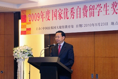 艾宏歌參贊介紹了“國家優(yōu)秀自費留學生獎學金”設立的背景和頒獎情況。他說,自2003年實施以來,總共有1900余名在外優(yōu)秀留學人員獲獎。2009年度獎勵規(guī)模達497人,其中在韓自費留學生13人獲獎。他希望同學們牢記張大使的囑托,奮發(fā)努力,為祖國的建設和中韓關系發(fā)展發(fā)揮積極作用。