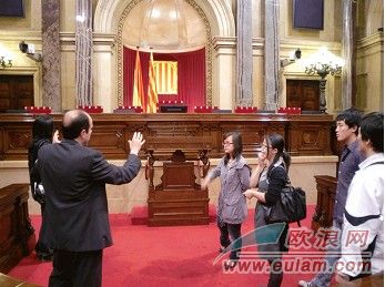 進入議會大廳以后,一名議會工作人員負責接待留學生,他詳細地向留學生們介紹了議會的歷史以及現況:加泰羅尼亞議會大樓原來是專門建立給西班牙國王和王后在巴塞羅那的寢宮,但建成以后王后沒有接受這個宮殿作為她的寢宮,所以該大樓也一直沒有作為宮殿用過。之后就作為存放武器和軍人的居住點,在弗拉明戈時期都是作為武力和壓迫的象征。該大樓從1932到1936年首次作為加泰羅尼亞議會,現在民主時代也就是從1980年再次作為議會使用。加泰羅尼亞各黨派議會議員現在都在此上班,加泰羅尼亞議會是審批加區各大小法律法規的地方,密切關系加區民眾民生。之后解說員帶領留學生們參觀了加議會各個大廳及各個會議室,向留學生們介紹了每個廳在議會的作用,正如我們經常在電視上看到的,比如召開記者發布會的記者大廳,議會議員表決大廳等等。議會的建筑設計風格即富麗堂皇又富有當地建筑風格氣息。
