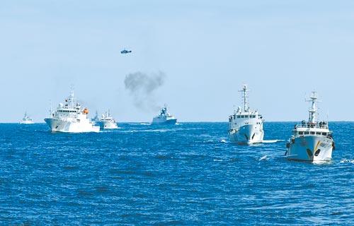 10月19日,中國海監(jiān)、漁政船只在中國海軍艦艇、飛機(jī)的支援掩護(hù)下進(jìn)行航渡。向南攝