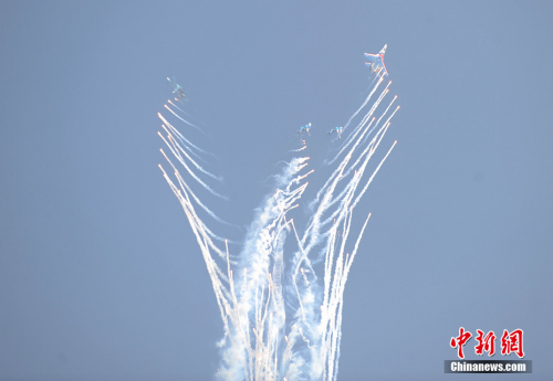 蘇-27編隊在藍天上咆哮,俄羅斯雄壯、富有節奏感的音樂在地上為它們伴奏,充滿力量的“空中芭蕾”令現場觀眾熱血沸騰。